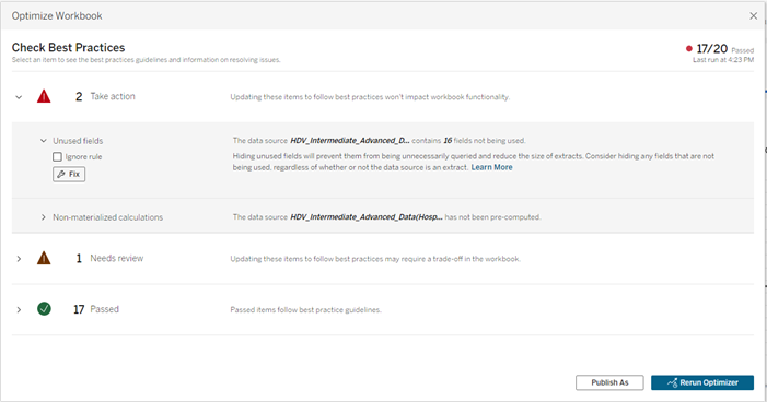 - Passed: Best practices your workbook already meets or items you’ve intentionally left as is. (for example, Tableau might flag multiple LODs as a concern, but you’ve determined they’re necessary).
