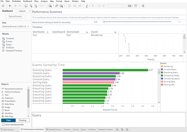 The performance results might look a bit technical at first glance, but here’s what to focus on. The Timeline view shows the sequence of events and how long each one took, while the Events view lists them by duration so you can quickly spot your biggest performance bottlenecks. Long-running queries, slow rendering, and complex calculations are usually the top culprits behind slow dashboards.