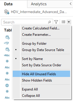 Next, be sure to hide any fields you don’t use in your visualizations. Right-click on these fields in the Data pane and choose ‘Hide’. Alternatively, you can hide all unused fields at once by clicking the drop-down arrow at the top right of the Data pane and selecting ‘Hide All Unused Fields’ — or let Tableau do it automatically when you run the Optimizer.