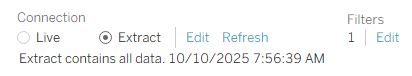 To switch from a live to extract connection, right-click your data source name and choose Extract Data. Alternatively, you can toggle the connection from ‘Live’ to ‘Extract’ on the Data Source tab.