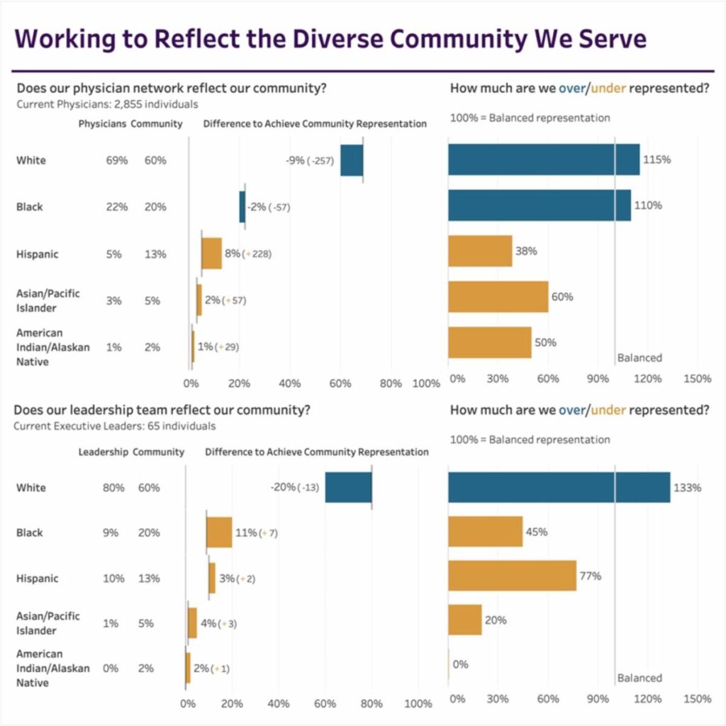 - In the top left of the display, the percentage of physicians by race and ethnicity currently on staff is listed, immediately followed by the same rates for the community they serve.