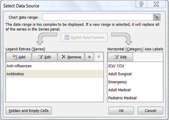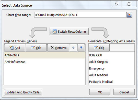 1. In the Select Data Source dialog box, under Legend Entries (Series), select the data series that you want to move to a different location in the sequence.