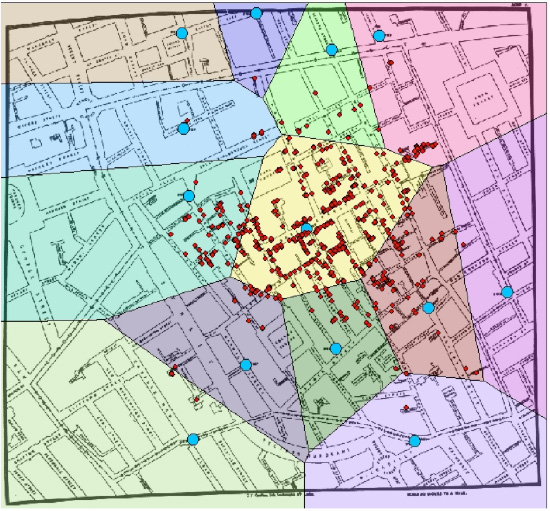He then re-drew the service area polygons (using nothing more than a pencil and string) to reflect the shortest routes along streets to wells, thereby revealing that an even larger proportion of the cholera deaths fell within the shortest-travel-distance area around the Broad Street pump. A modern-day version of this technique is displayed in the following version of Snow’s original map: