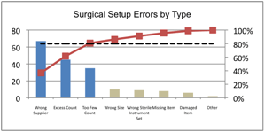 In this example presenting the data using a Pareto Chart displays how three (3) of the error types account for 80% of all errors: Wrong Supplier, Excess Count, and Too Few Count —