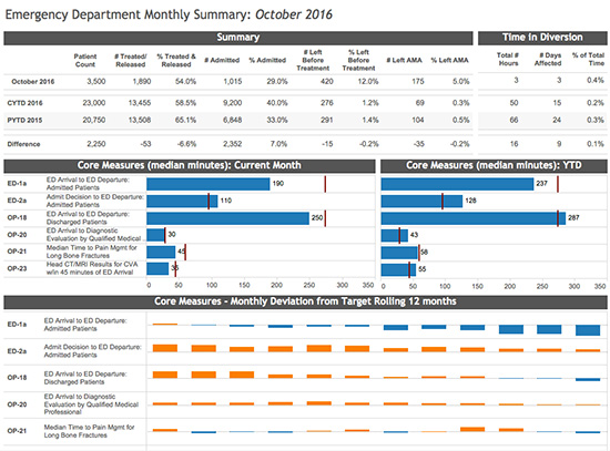 At the top of the dashboard is a table of summary performance metrics (number of patients seen and treated; time in diversion due to ED Overload) for the current month vs. current and previous years, and change over time. The middle bar charts provide the Director with the current month and YTD performance compared to targets for the metrics often tied to third-party, value- based (pay-for-performance) reimbursement. The deviation graphs at the bottom of the dashboard provide context for monthly performance compared to targets trended over time.