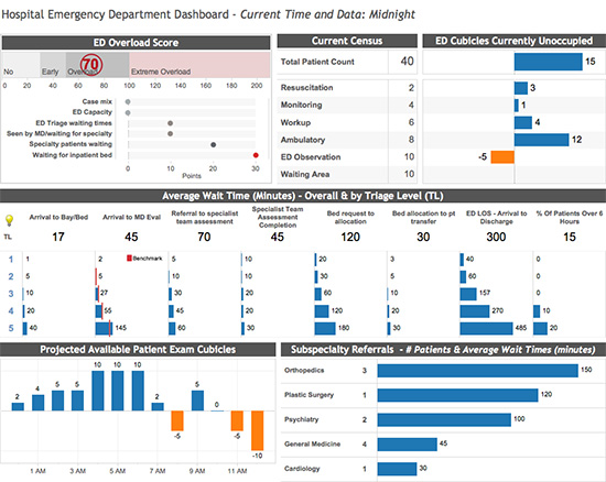 All of this dashboard’s metrics are designed to help the ED Operations Manager identify active and potential bottlenecks, and to act to meet the objectives: delivering timely and appropriate care, and avoiding ED overload.